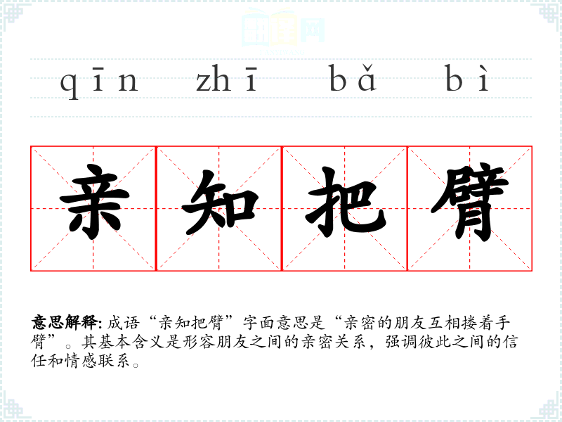 成语“亲知把臂”字面意思是“亲密的朋友互相搂着手臂”。其基本含义是形容朋友之间的亲密关系,强调彼此之间的信任和情感联系。