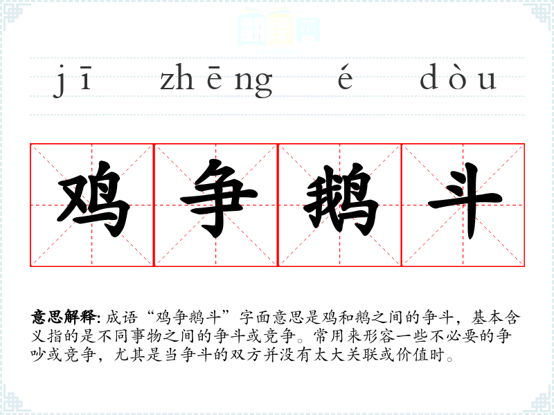 成语“鸡争鹅斗”字面意思是鸡和鹅之间的争斗,基本含义指的是不同事物之间的争斗或竞争。常用来形容一些不必要的争吵或竞争,尤其是当争斗的双方并没有太大关联或价值时。