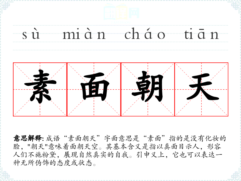 成语“素面朝天”字面意思是“素面”指的是没有化妆的脸,"朝天"意味着面朝天空。其基本含义是指以真面目示人,形容人们不施粉黛,展现自然真实的自我。引申义上,它也可以表达一种无所伪饰的态度或状态。
