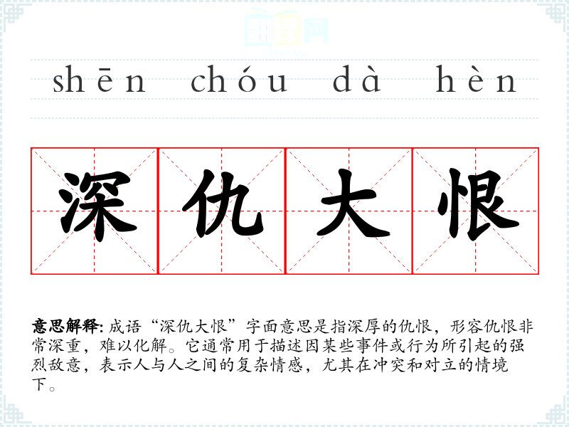 成语“深仇大恨”字面意思是指深厚的仇恨,形容仇恨非常深重,难以化解。它通常用于描述因某些**或行为所引起的强烈敌意,表示人与人之间的复杂情感,尤其在冲突和对立的情境下。