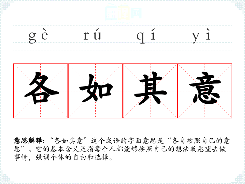 “各如其意”这个成语的字面意思是“各自按照自己的意愿”。它的基本含义是指每个人都能够按照自己的想法或愿望去做事情,强调个体的自由和选择。