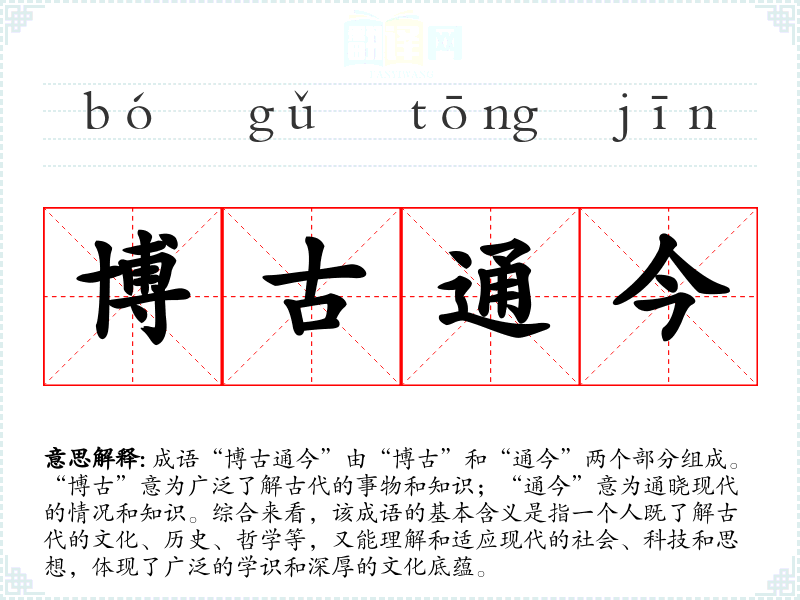 - 通晓古今:指对古代和现代的知识都很清楚。