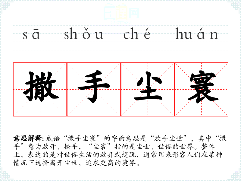成语“撒手尘寰”的字面意思是“放手尘世”,其中“撒手”意为放开、松手,“尘寰”指的是尘世、世俗的世界。整体上,表达的是对世俗生活的放弃或超脱,通常用来形容人们在某种情况下选择离开尘世,追求更高的境界。