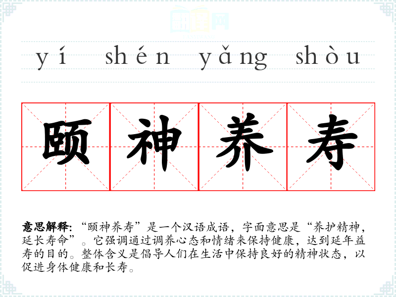 “颐神养寿”是一个汉语成语,字面意思是“养护精神,延长寿命”。它强调通过调养心态和情绪来保持健康,达到延年益寿的目的。整体含义是倡导人们在生活中保持良好的精神状态,以促进身体健康和长寿。