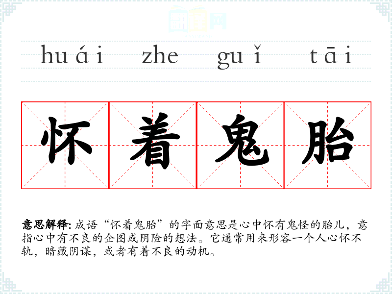 成语“怀着鬼胎”的字面意思是心中怀有鬼怪的胎儿,意指心中有不良的企图或阴险的想法。它通常用来形容一个人心怀不轨,暗藏阴谋,或者有着不良的动机。