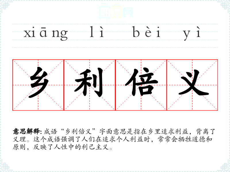 成语“乡利倍义”字面意思是指在乡里追求利益,背离了义理。这个成语强调了人们在追求个人利益时,常常会牺牲道德和原则,反映了人性中的利己主义。