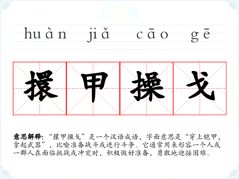这个成语的来源可以追溯到**古代的战争场景。在古代,士兵在出征之前会穿上铠甲,手持武器,准备迎战敌人。成语中的“擐甲”指的是穿上铠甲的动作,而“操戈”则是指拿起战戈,象征着战斗的准备。尽管没有特定的典故,但它反映了古代武士的战斗精神和为保卫国家而勇往直前的决心。