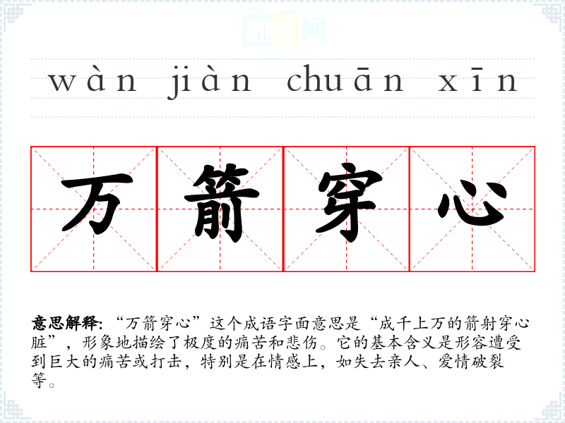 “万箭穿心”这个成语字面意思是“成千上万的箭射穿心脏”,形象地描绘了极度的痛苦和悲伤。它的基本含义是形容遭受到巨大的痛苦或打击,特别是在情感上,如失去亲人、爱情破裂等。