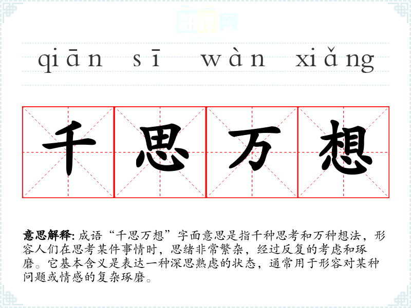 - 日常对话:用来形容自己在做决定时的复杂思考,比如:“这件事情我已经千思万想,还是无法决定。”