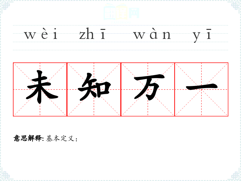 成语“未知万一”字面意思是“还不知道万一的情况”。它的基本含义是指在某种情况下,可能会出现许多不确定的因素,具体结果尚未可知。这常用于强调事情的不可预知性或潜在的风险。
