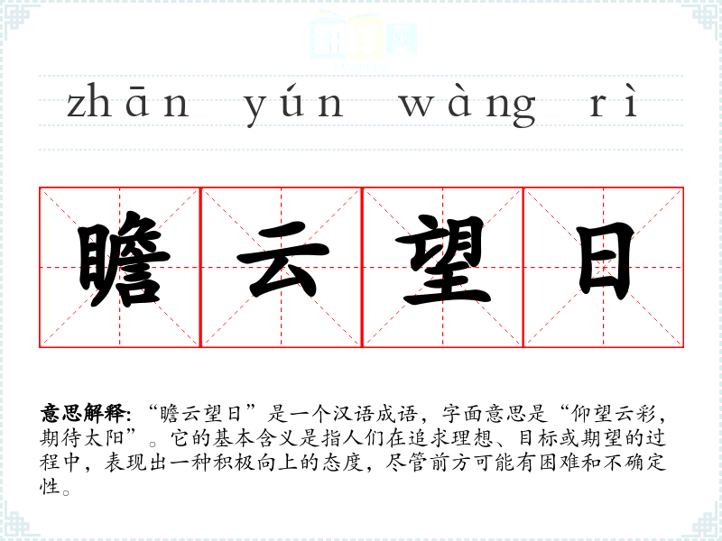“瞻云望日”是一个汉语成语,字面意思是“仰望云彩,期待太阳”。它的基本含义是指人们在追求理想、目标或期望的过程中,表现出一种积极向上的态度,尽管前方可能有困难和不确定性。