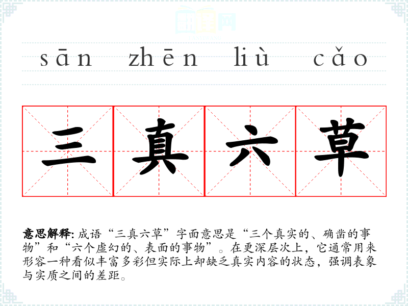 成语“三真六草”字面意思是“三个真实的、确凿的事物”和“六个虚幻的、表面的事物”。在更深层次上,它通常用来形容一种看似丰富多彩但实际上却缺乏真实内容的状态,强调表象与实质之间的差距。