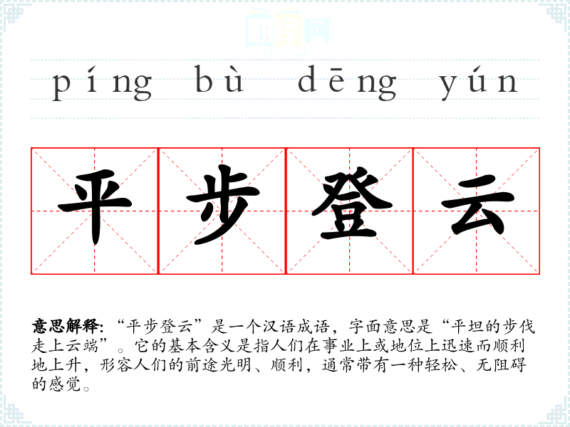 “平步登云”是一个汉语成语,字面意思是“平坦的步伐走上云端”。它的基本含义是指人们在事业上或地位上迅速而顺利地上升,形容人们的前途光明、顺利,通常带有一种轻松、无阻碍的感觉。
