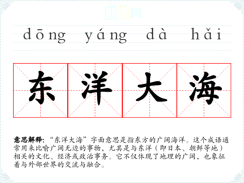 “东洋大海”字面意思是指东方的广阔海洋。这个成语通常用来比喻广阔无边的事物,尤其是与东洋(即日本、朝鲜等地)相关的文化、经济或政治事务。它不仅体现了地理的广阔,也象征着与外部世界的交流与融合。