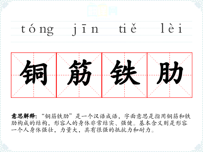 “铜筋铁肋”是一个汉语成语,字面意思是指用铜筋和铁肋构成的结构,形容人的身体非常结实、强健。基本含义则是形容一个人身体强壮,力量大,具有很强的抵抗力和耐力。