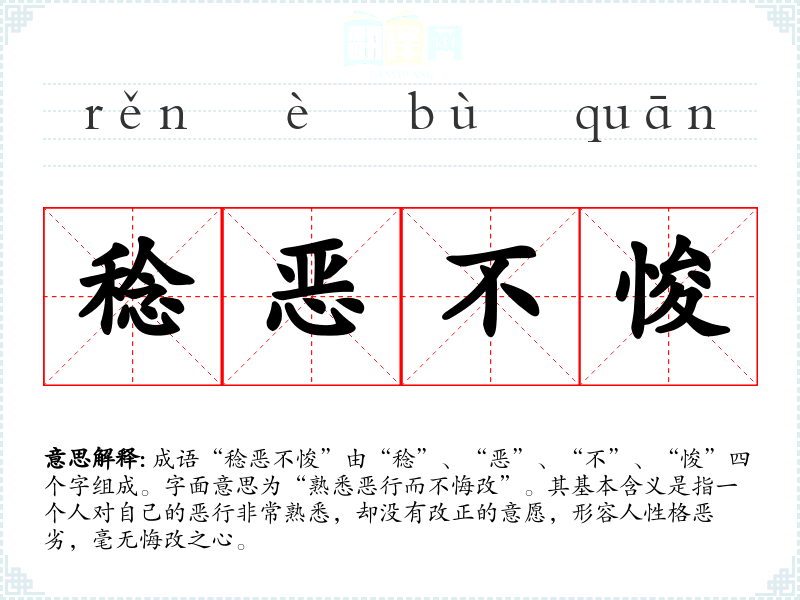 成语“稔恶不悛”由“稔”、“恶”、“不”、“悛”四个字组成。字面意思为“熟悉恶行而不悔改”。其基本含义是指一个人对自己的恶行非常熟悉,却没有改正的意愿,形容人性格恶劣,毫无悔改之心。