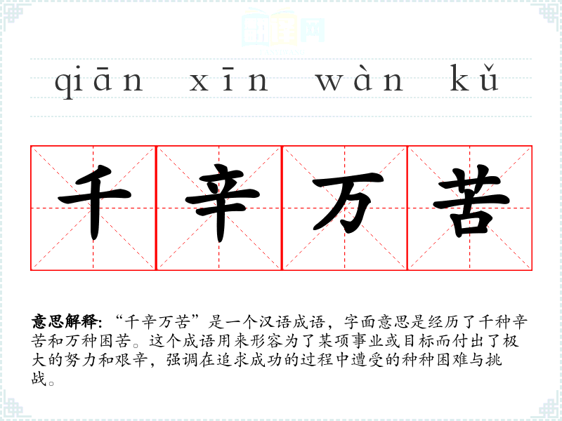 “千辛万苦”是一个汉语成语,字面意思是经历了千种辛苦和万种困苦。这个成语用来形容为了某项事业或目标而付出了极大的努力和艰辛,强调在追求成功的过程中遭受的种种困难与挑战。