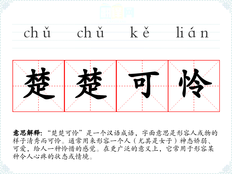 “楚楚可怜”是一个汉语成语,字面意思是形容人或物的样子清秀而可怜。通常用来形容一个人(尤其是女子)神态娇弱、可爱,给人一种怜惜的感觉。在更广泛的意义上,它常用于形容某种令人心疼的状态或情境。