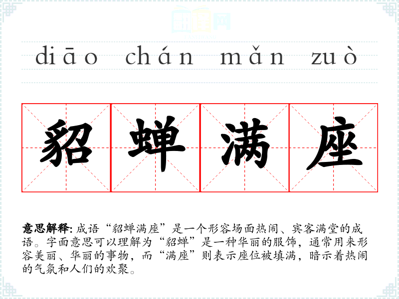 成语“貂蝉满座”是一个形容场面热闹、宾客满堂的成语。字面意思可以理解为“貂蝉”是一种华丽的服饰,通常用来形容美丽、华丽的事物,而“满座”则表示座位被填满,暗示着热闹的气氛和人们的欢聚。