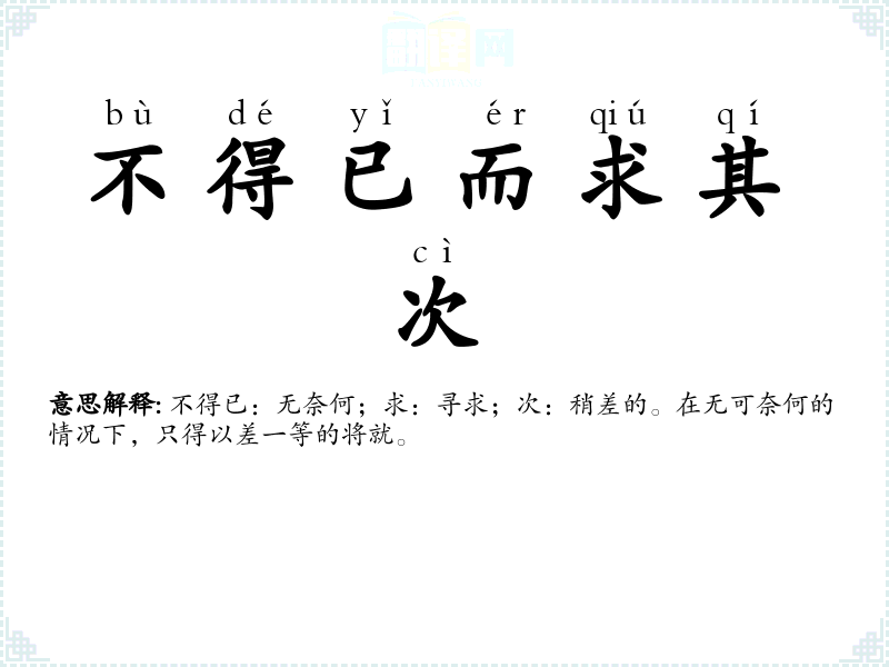 不得已:无奈何;求:寻求;次:稍差的。在无可奈何的情况下,只得以差一等的将就。 |