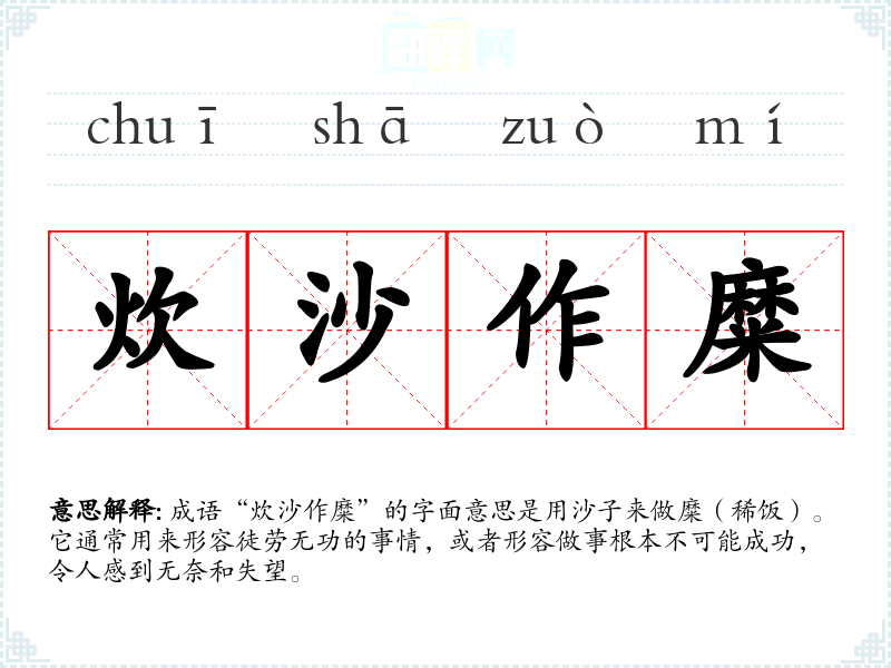 成语“炊沙作糜”的字面意思是用沙子来做糜(稀饭)。它通常用来形容徒劳无功的事情,或者形容做事根本不可能成功,令人感到无奈和失望。