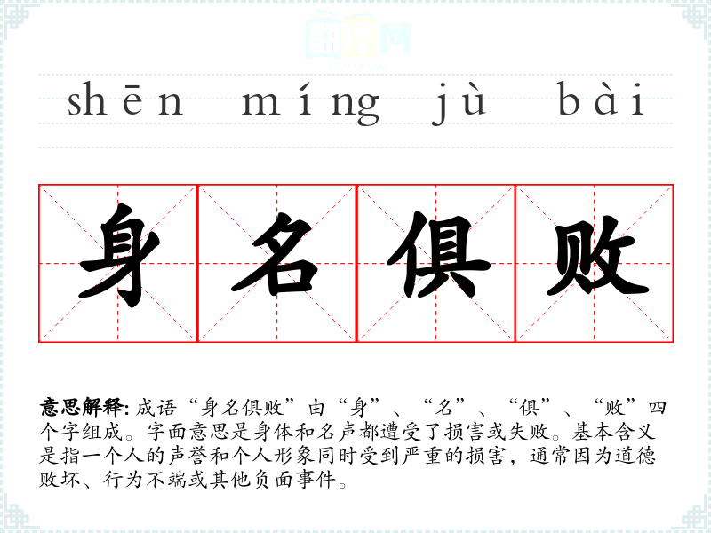 成语“身名俱败”由“身”、“名”、“俱”、“败”四个字组成。字面意思是身体和名声都遭受了损害或失败。基本含义是指一个人的声誉和个人形象同时受到严重的损害,通常因为道德败坏、行为不端或其他负面**。