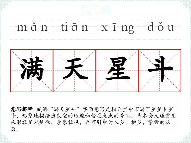 成语“满天星斗”字面意思是指天空中布满了星星和星斗,形象地描绘出夜空的璀璨和繁星点点的美丽。基本含义通常用来形容星光灿烂,景象壮观,也可引申为人多、物多,繁荣的状态。