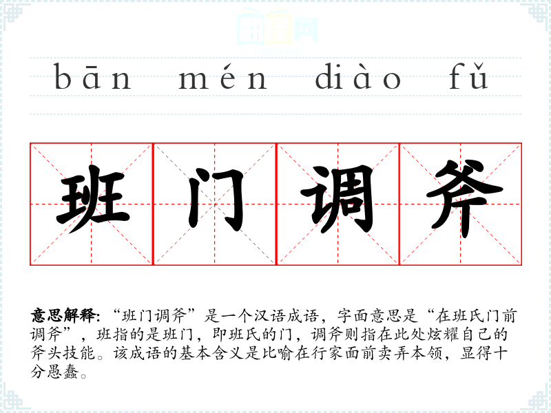 “班门调斧”是一个汉语成语,字面意思是“在班氏门前调斧”,班指的是班门,即班氏的门,调斧则指在此处炫耀自己的斧头技能。该成语的基本含义是比喻在行家面前卖弄本领,显得十分愚蠢。
