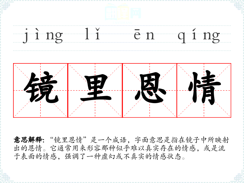 “镜里恩情”是一个成语,字面意思是指在镜子中所映射出的恩情。它通常用来形容那种似乎难以真实存在的情感,或是流于表面的情感,强调了一种虚幻或不真实的情感状态。
