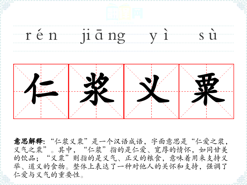 “仁浆义粟”是一个汉语成语,字面意思是“仁爱之浆,义气之粟”。其中,“仁浆”指的是仁爱、宽厚的情怀,如同甘美的饮品;“义粟”则指的是义气、正义的粮食,意味着用来支持义举、道义的食物。整体上表达了一种对他人的关怀和支持,强调了仁爱与义气的重要性。