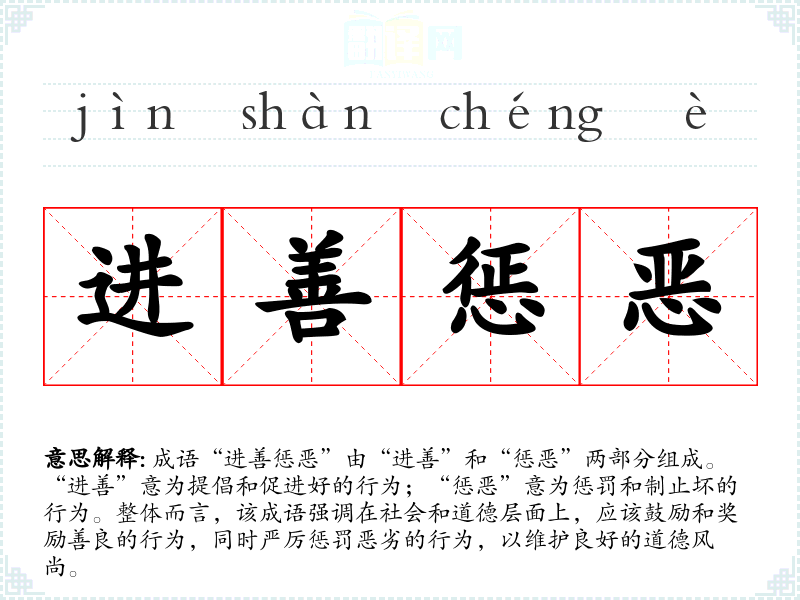 | 进善惩恶 | 进用善良,惩治奸恶。同“进善惩奸”。 |