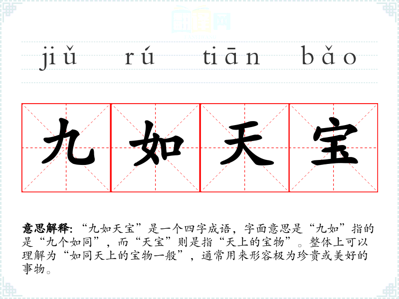 “九如天宝”是一个四字成语,字面意思是“九如”指的是“九个如同”,而“天宝”则是指“天上的宝物”。整体上可以理解为“如同天上的宝物一般”,通常用来形容极为珍贵或美好的事物。