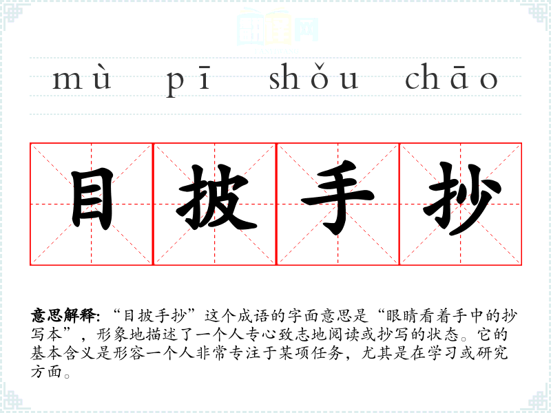 “目披手抄”这个成语的字面意思是“眼睛看着手中的抄写本”,形象地描述了一个人专心致志地阅读或抄写的状态。它的基本含义是形容一个人非常专注于某项任务,尤其是在学习或研究方面。