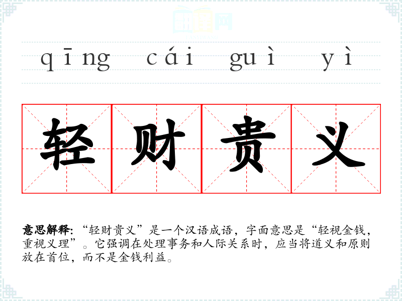 “轻财贵义”是一个汉语成语,字面意思是“轻视金钱,重视义理”。它强调在处理事务和人际关系时,应当将道义和原则放在首位,而不是金钱利益。