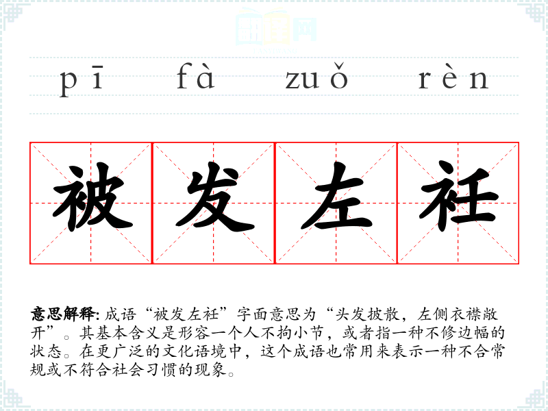 成语“被发左衽”字面意思为“头发披散,左侧衣襟敞开”。其基本含义是形容一个人不拘小节,或者指一种不修边幅的状态。在更广泛的文化语境中,这个成语也常用来表示一种不合常规或不符合社会*惯的现象。