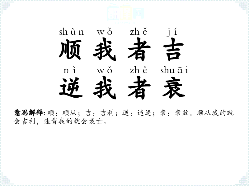 顺:顺从;成:成功;逆:违逆;败:失败。顺从他的就能成功,违逆他的必会失败。 |
