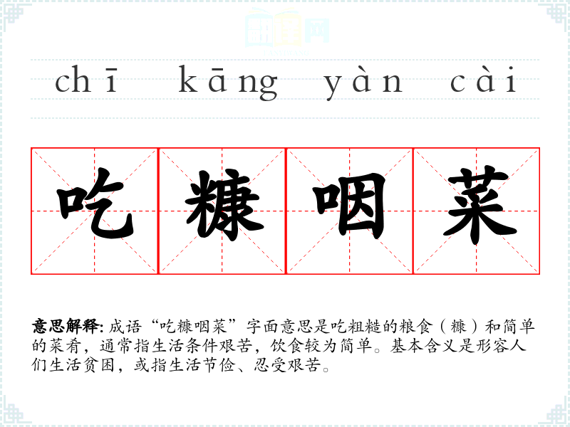 成语“吃糠咽菜”字面意思是吃粗糙的粮食(糠)和简单的菜肴,通常指生活条件艰苦,饮食较为简单。基本含义是形容人们生活贫困,或指生活节俭、忍受艰苦。