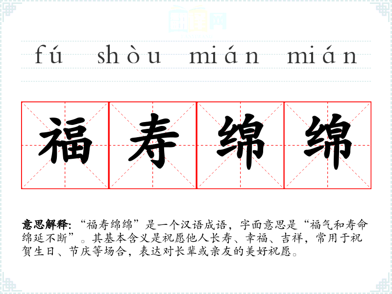 “福寿绵绵”是一个汉语成语,字面意思是“福气和寿命绵延不断”。其基本含义是祝愿他人长寿、幸福、吉祥,常用于祝贺生日、节庆等场合,表达对长辈或亲友的美好祝愿。