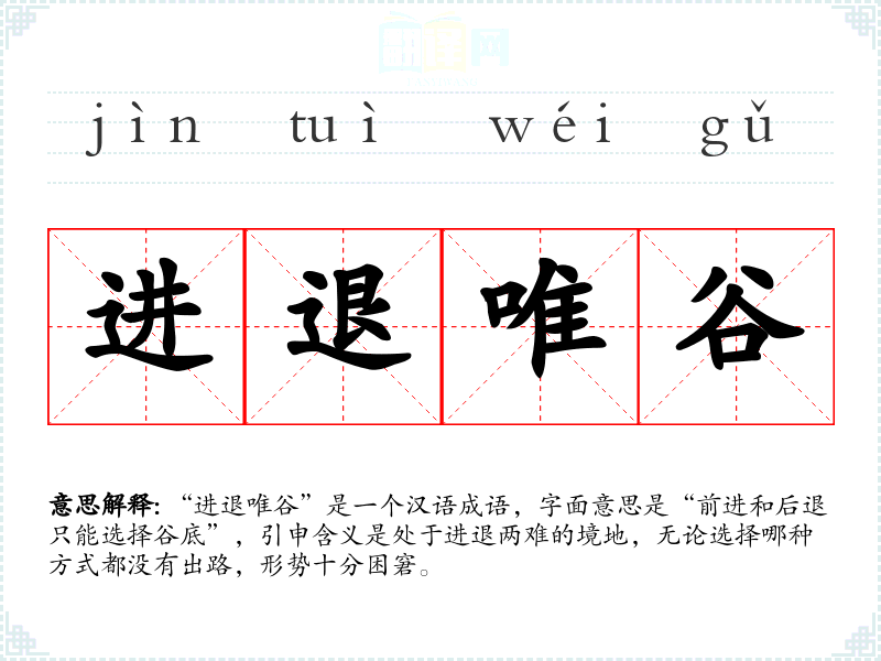 “进退唯谷”是一个汉语成语,字面意思是“前进和后退只能选择谷底”,引申含义是处于进退两难的境地,无论选择哪种方式都没有出路,形势十分困窘。