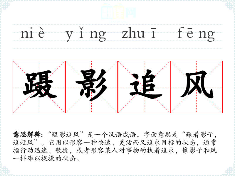 “蹑影追风”是一个汉语成语,字面意思是“踩着影子,追赶风”。它用以形容一种快速、灵活而又追求目标的状态,通常指行动迅速、敏捷,或者形容某人对事物的执着追求,像影子和风一样难以捉摸的状态。