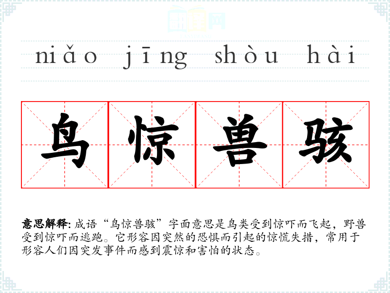成语“鸟惊兽骇”字面意思是鸟类受到惊吓而飞起,野兽受到惊吓而逃跑。它形容因突然的恐惧而引起的惊慌失措,常用于形容人们因突发**而感到震惊和害怕的状态。