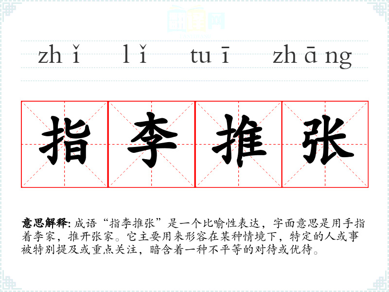 成语“指李推张”是一个比喻性表达,字面意思是用手指着李家,推开张家。它主要用来形容在某种情境下,特定的人或事被特别提及或重点关注,暗含着一种不平等的对待或优待。