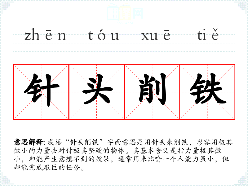 成语“针头削铁”字面意思是用针头来削铁,形容用极其微小的力量去对付极其坚硬的物体。其基本含义是指力量极其微小,却能产生意想不到的效果,通常用来比喻一个人能力虽小,但却能完成艰巨的任务。
