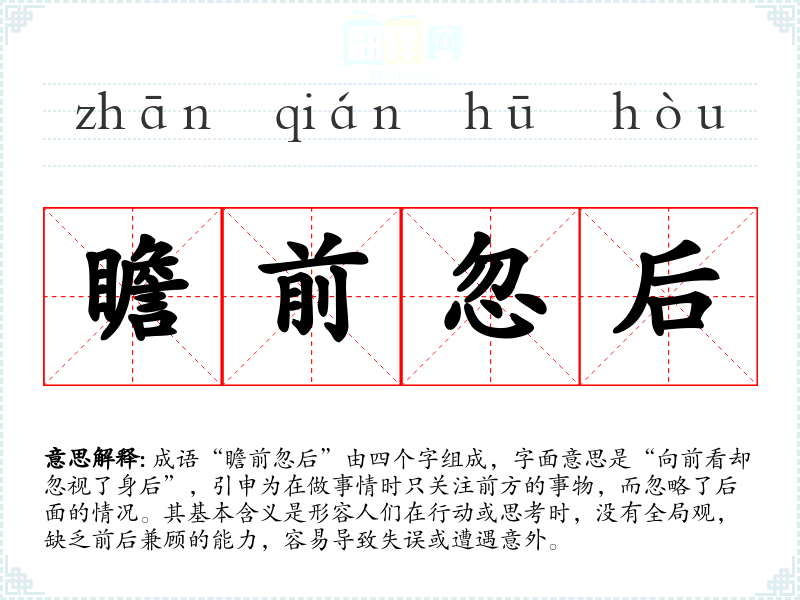 成语“瞻前忽后”由四个字组成,字面意思是“向前看却忽视了身后”,引申为在做事情时只关注前方的事物,而忽略了后面的情况。其基本含义是形容人们在行动或思考时,没有全局观,缺乏前后兼顾的能力,容易导致失误或遭遇意外。