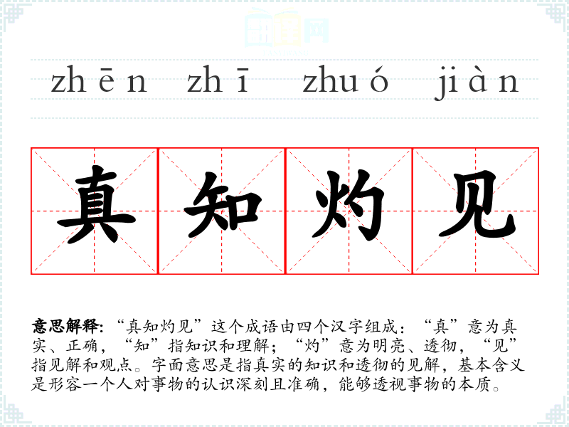 “真知灼见”这个成语由四个汉字组成:“真”意为真实、正确,“知”指知识和理解;“灼”意为明亮、透彻,“见”指见解和观点。字面意思是指真实的知识和透彻的见解,基本含义是形容一个人对事物的认识深刻且准确,能够透视事物的本质。