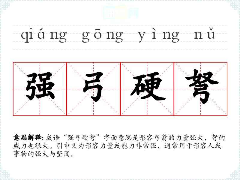 成语“强弓硬弩”字面意思是形容弓箭的力量强大,弩的威力也很大。引申义为形容力量或能力非常强,通常用于形容人或事物的强大与坚固。