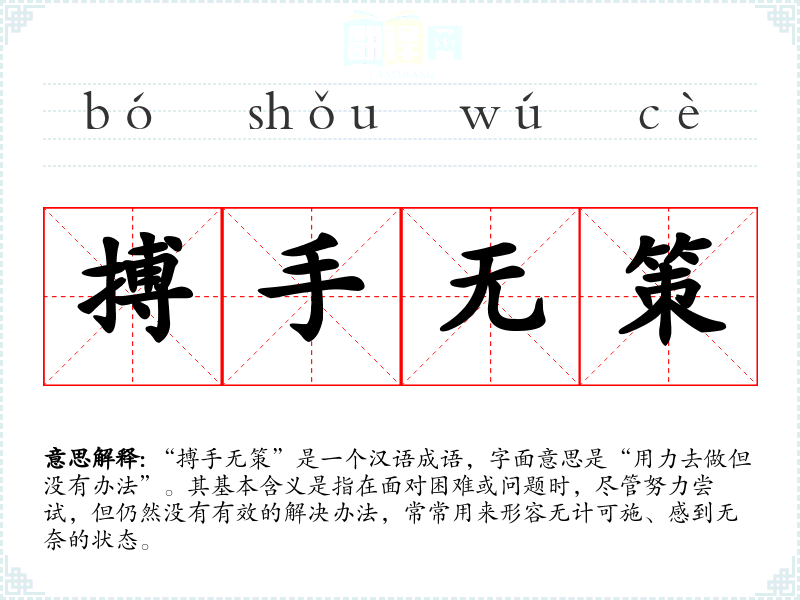 “搏手无策”是一个汉语成语,字面意思是“用力去做但没有办法”。其基本含义是指在面对困难或问题时,尽管努力尝试,但仍然没有有效的解决办法,常常用来形容无计可施、感到无奈的状态。