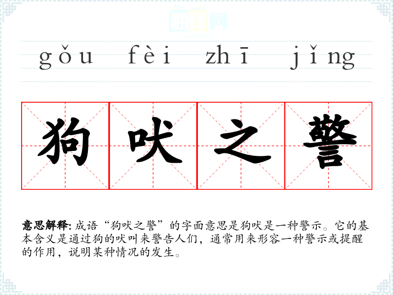 成语“狗吠之警”的字面意思是狗吠是一种警示。它的基本含义是通过狗的吠叫来警告人们,通常用来形容一种警示或提醒的作用,说明某种情况的发生。