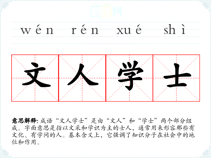 成语“文人学士”是由“文人”和“学士”两个部分组成。字面意思是指以文采和学识为主的士人,通常用来形容那些有文化、有学问的人。基本含义上,它强调了知识分子在社会中的地位和作用。
