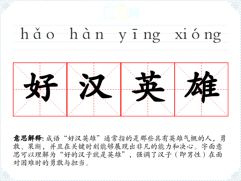 成语“好汉英雄”通常指的是那些具有英雄气概的人,勇敢、果断,并且在关键时刻能够展现出非凡的能力和决心。字面意思可以理解为“好的汉子就是英雄”,强调了汉子(即男性)在面对困难时的勇敢与担当。